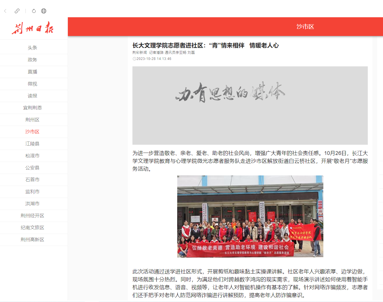 为进一步营造敬老、亲老、爱老、助老的社会风尚,增强广大青年的社会责任感。10月26日,一竞技官网教育与心理学院微光志愿者服务队走进沙市区解放街道白云桥社区,开展“敬老月”志愿服务活动。