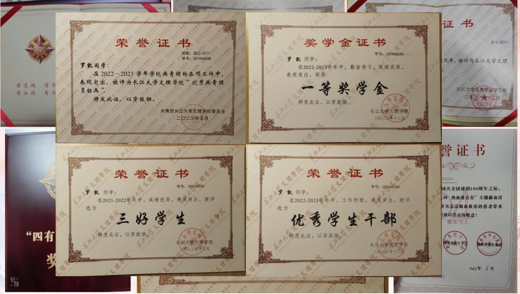 勤能补拙是良训,一分辛劳一分才。大一学年,他的综合测评为专业第一,荣获学院“一等奖学金”和“三好员工”等荣誉。积极带头参加各项学科竞赛,获得第十七届全国老员工征文比赛省一等奖、第十三届全国老员工电子商务“创新、创意及创业”挑战赛省级二等奖、全国老员工英语竞赛优秀奖,顺利通过普通话二甲、英语四级考试。学习之余,积极投身于志愿服务活动,以奉献之我为构建新时代筑力。他先后参与了荆州市首届楚文化节、荆州市“曹灿杯”青少年朗诵展示、走进社区——慰问抗战老兵、2022年全国科技志愿服务示范团队等志愿服务活动,还积极组织了暑期三下乡—圆梦工程“农村未成年人优秀传统文化传承志愿服务”、荆州市科技馆志愿服务、荆州市特殊教育学校志愿服务及荆州市为流浪小动物募捐志愿服务等50余项志愿服务活动。个人累计志愿时长也达到了1100个小时。