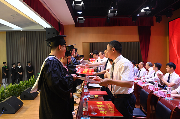 毕业典礼上,与会领导一同为受表彰的同学颁发毕业证书和荣誉证书。